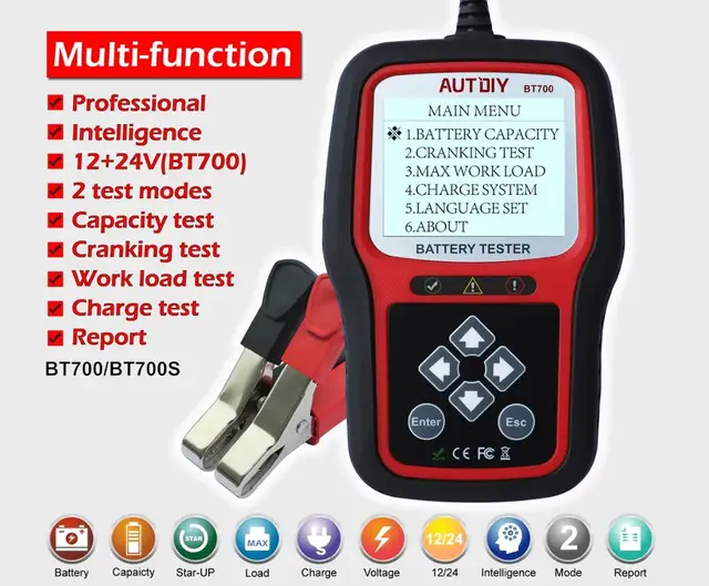 Product descriptionThis Product is one of Hot Product (New) Catalog and Category in Aliexpress, it meant get Good Sales and Good Rated by Most Buyers.Cheap Price AUTDIY BT700 Car Battery Tester 12/24V Auto Battery Analyzer 2 Test Mode Quick/Accurate Vehicle Bat with Free Worldwide Shipping!